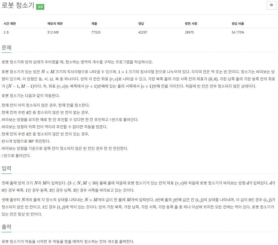 문제에 주어진 청소기 작동 순서대로 현재 칸을 기준으로 상하좌우 칸을 탐색하면서 청소가 된 칸인지 되지 않은 칸인지 확인한다.