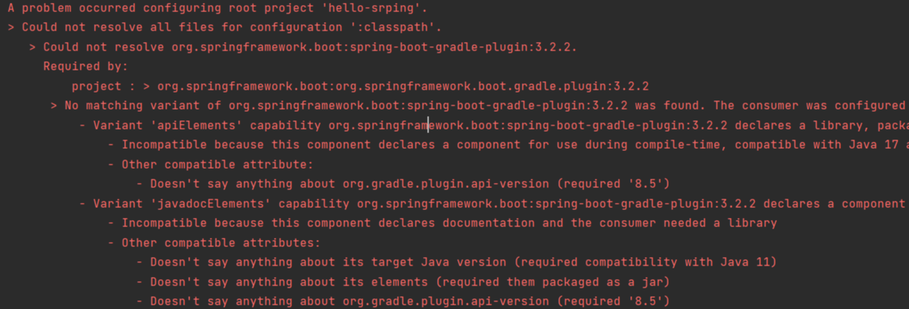 > No matching variant of org.springframework.boot:spring-boot-gradle-plugin:3.2.2 was found. The consumer was configured to find a library for use during runtime, compatible with Java 11, packaged as a jar, and its dependencies declared externally, as well as attribute 'org.gradle.plugin.api-version' with value '8.5' but: