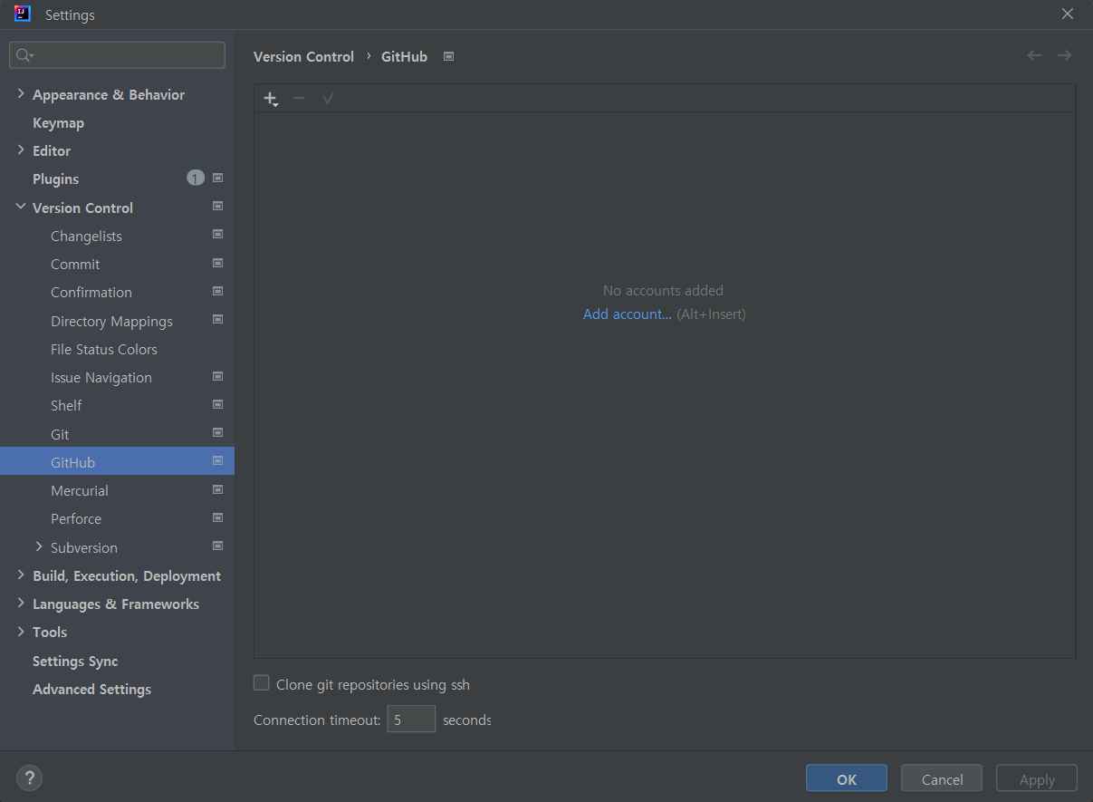 File → Settings → Version Control → Github → Add Count... → 계정 추가