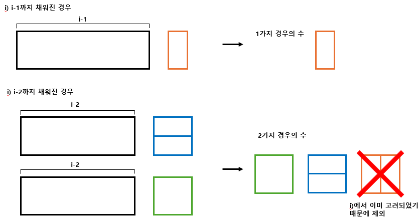 - 즉, 왼쪽부터 차례대로 바닥을 채운다고 가정하고 다음 두 가지 경우만 고려하면 된다.