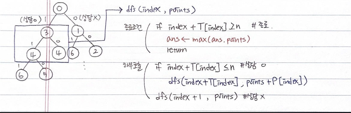 points+P[index](현재상담으로 얻는 이익) 해서 재귀호출 - 상담을 진행하지 않을 경우 : index+1 해서 재귀호출