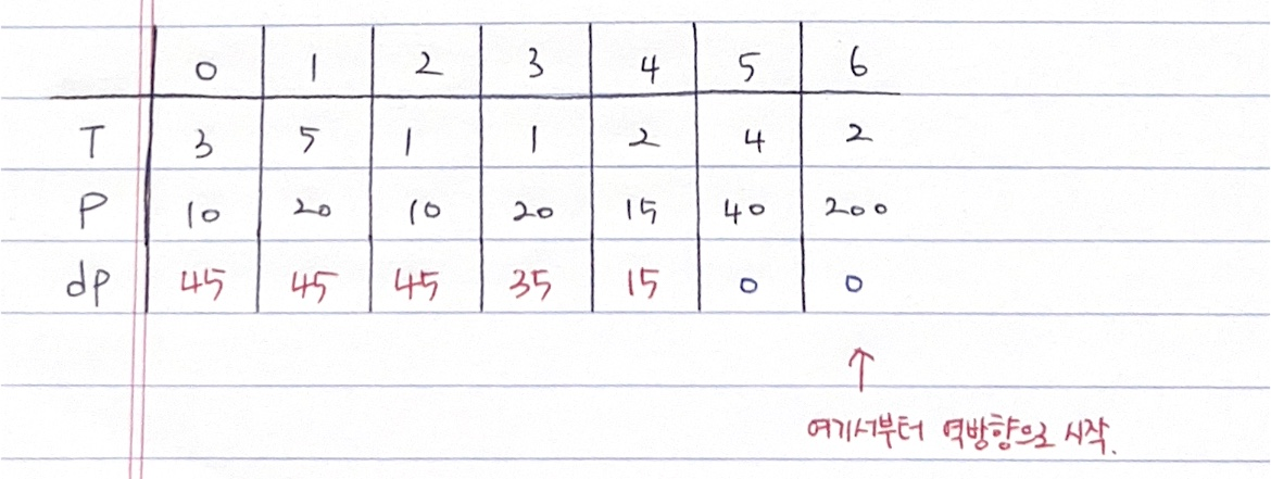 - 상담을 진행할 경우 : 현재부터 3일 후의 이익 최댓값(dp[3]) + 현재 상담의 이익(P[0]) = 45