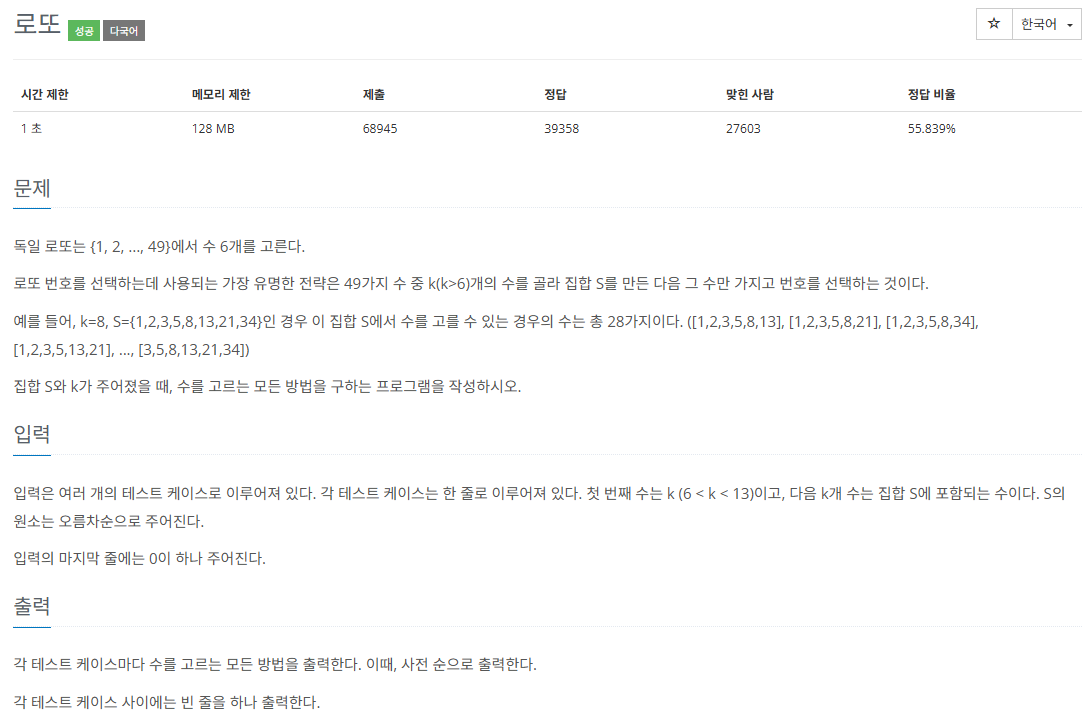집합 S에서 6개의 수를 고르는 방법을 사전순으로 모두 출력한다. 6개의 수를 고를 때, 숫자의 순서는 상관없다.
