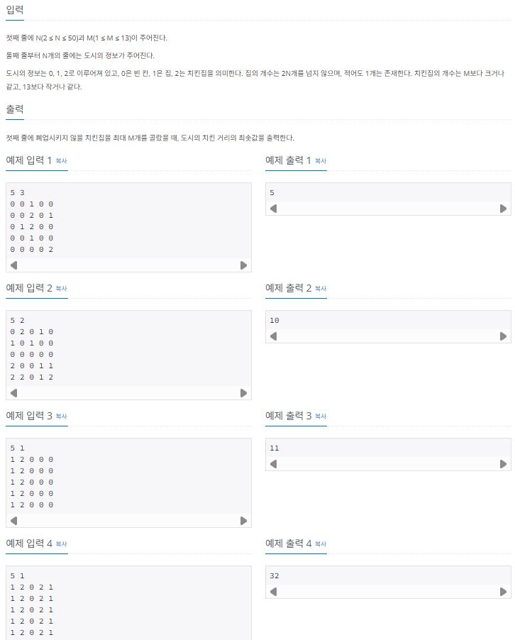 - cityChicken( ) : houseChicken() 에서 구한 치킨거리를 모두 더해서 도시의 치킨거리를 구한다. 그리고 도시의 치킨거리의 최솟값을 구한다.