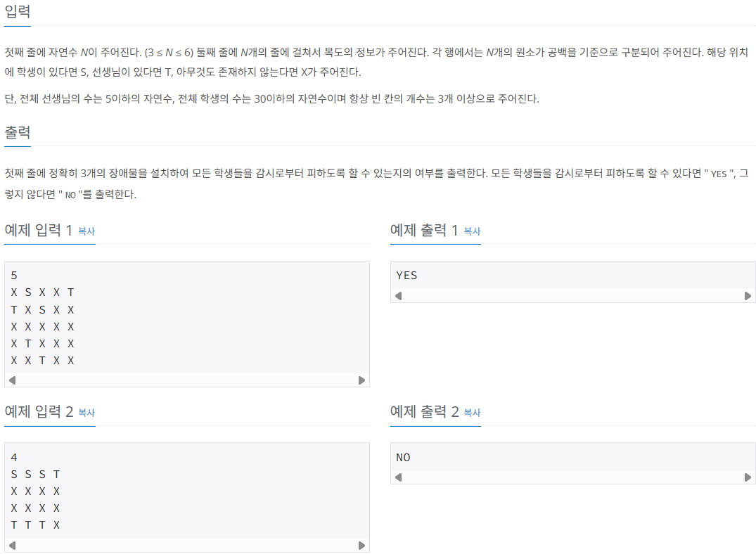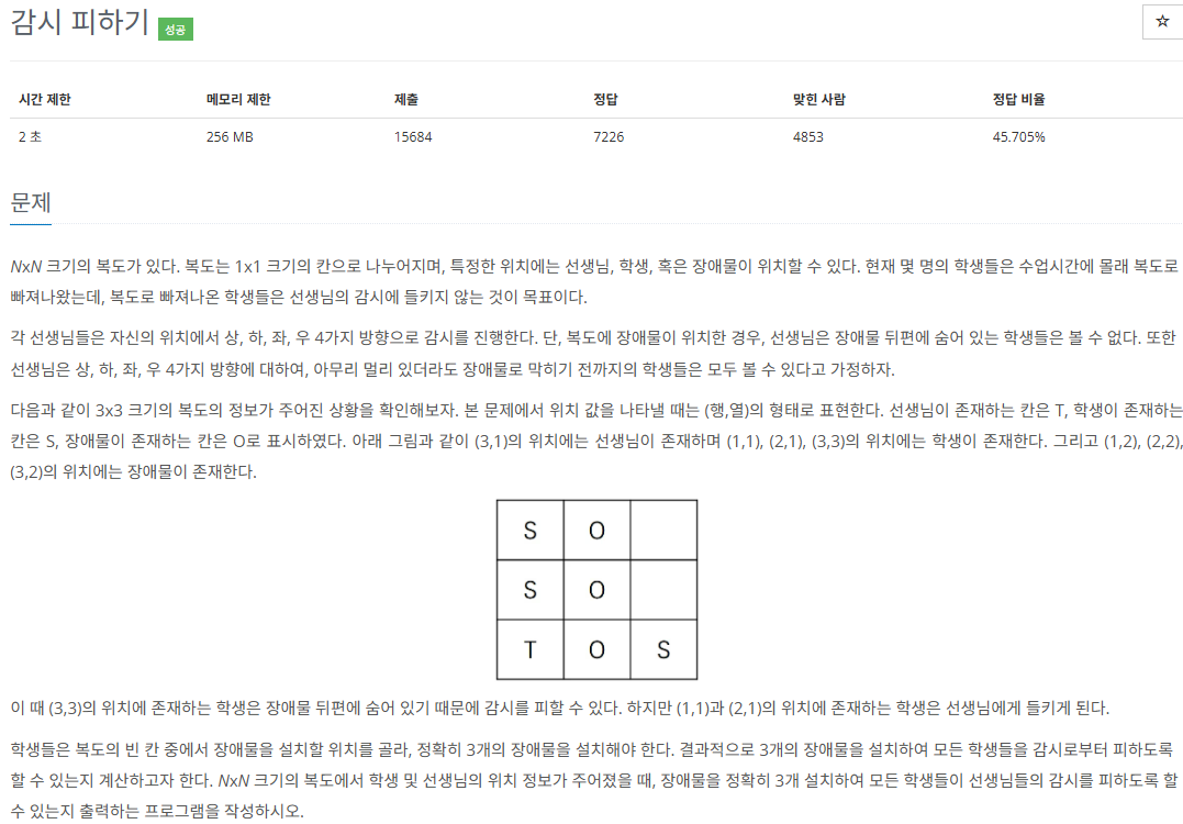 - 벽이 3개가가 된 경우, bfs 탐색으로 현재 상태에서 모든 학생이 감시를 피할 수 있는지 확인한다.