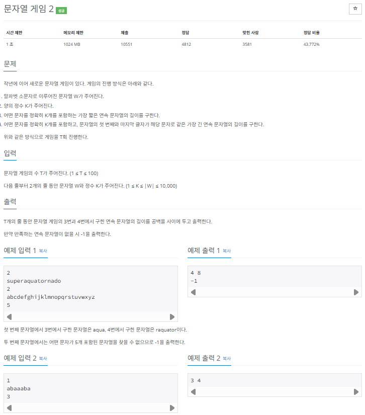알파벳 소문자로 이루어진 문자열 w와 양의 정수 k가 주어질 때, 아래 두 개에 해당되는 문자열의 길이를 구한다.