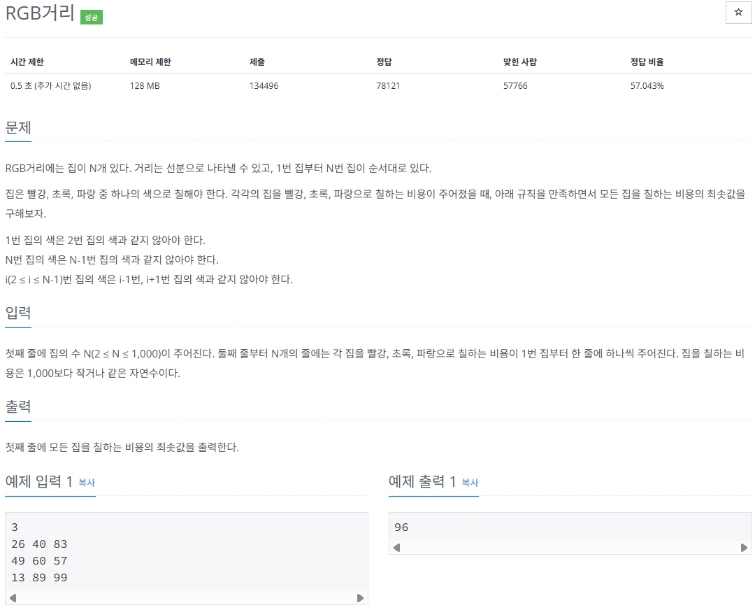 1 ~ N 번의 집을 아래 규칙을 따라서 빨강, 초록, 파랑 중 하나를 골라 색을 칠하는 데 드는 비용의 최솟값을 구한다.