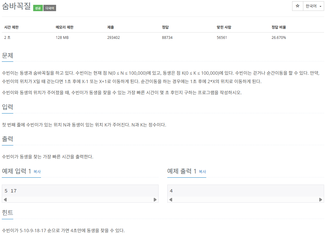 수빈의 위치 N, 동생의 위치 K에 있고, 수빈이 이동해서 동생을 찾는다.
