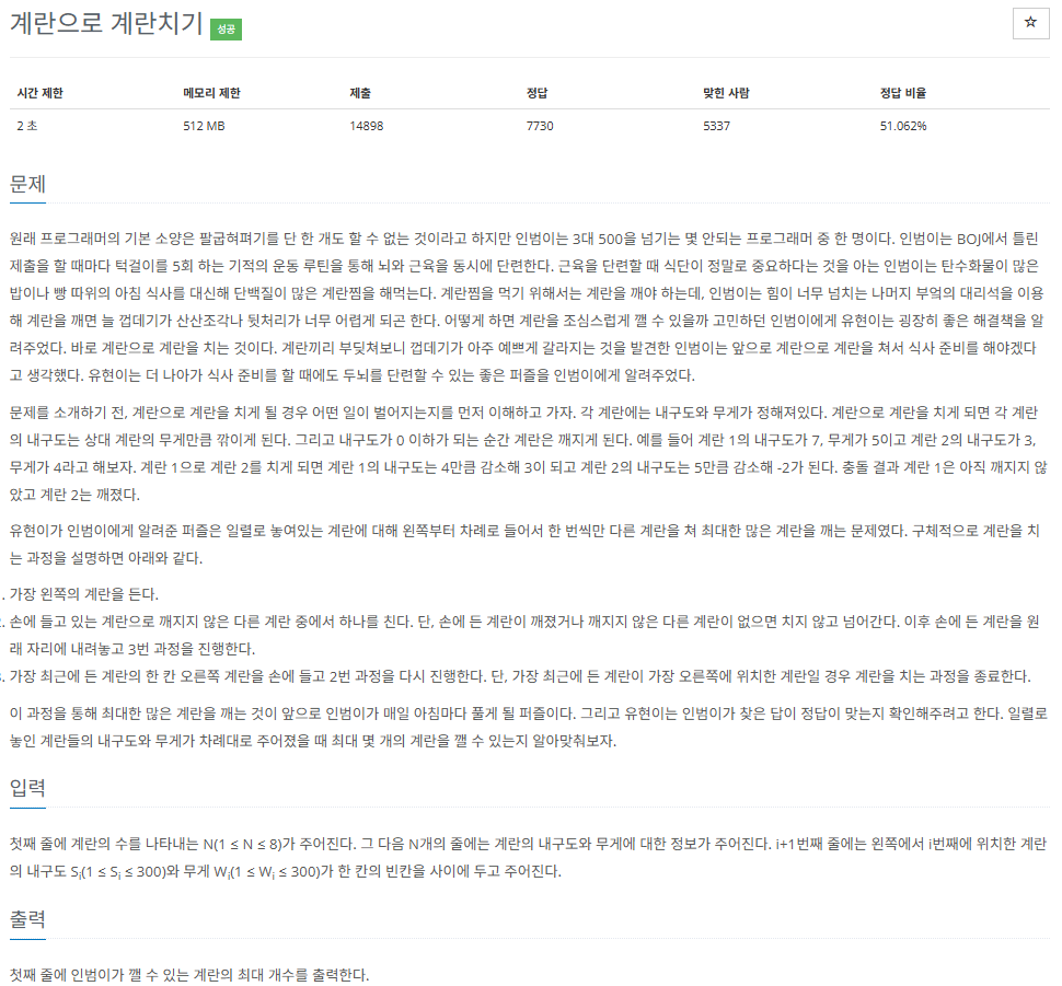 ex) 계란 1의 내구도 7 무게 5, 계란 2의 내구도 3 무게 4