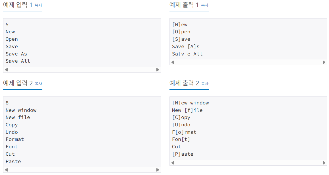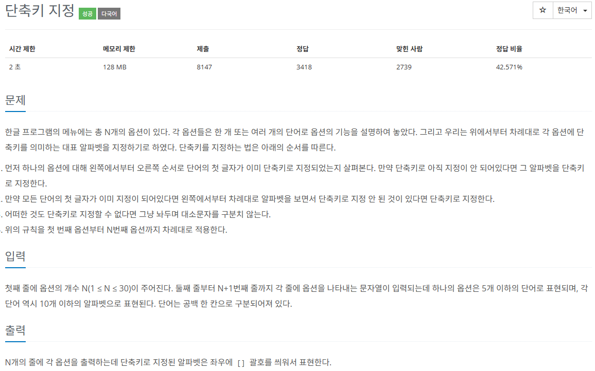 [백준][Java] 1283번 : 단축키 지정
